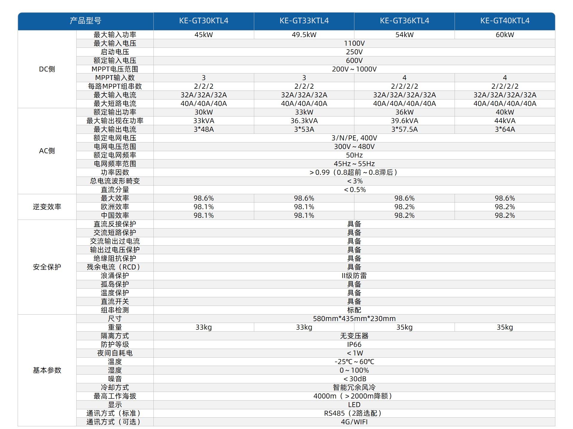 最大效率98.6%,超低启动电压,超宽电压范围;支持1.5倍直流超配,适配高达16A大电流组件;最大输入电压1100V,支持多种组件串并联方案;宽温度运行范围,支持45℃不降额;高精度智能组串检测。